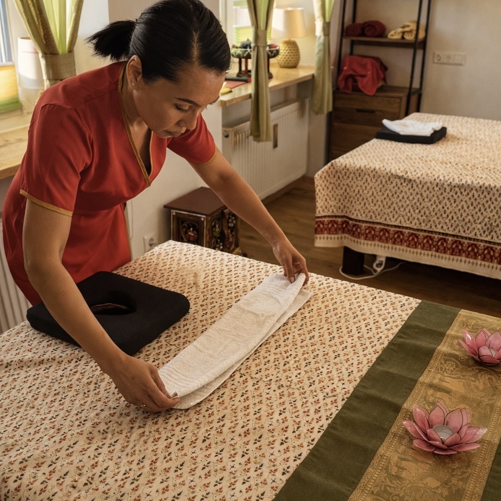 Unsere erfahrene Therapeutin bringt die jahrhundertealte Kunst der Thaimassage, kombiniert mit Elementen aus Aromatherapie und speziellen Behandlungen, auf professionelle Weise zur Anwendung. Dabei stehen stets Ihr Wohlbefinden, Ihre Gesundheit und Ihre ganz persönliche Auszeit im Mittelpunkt.